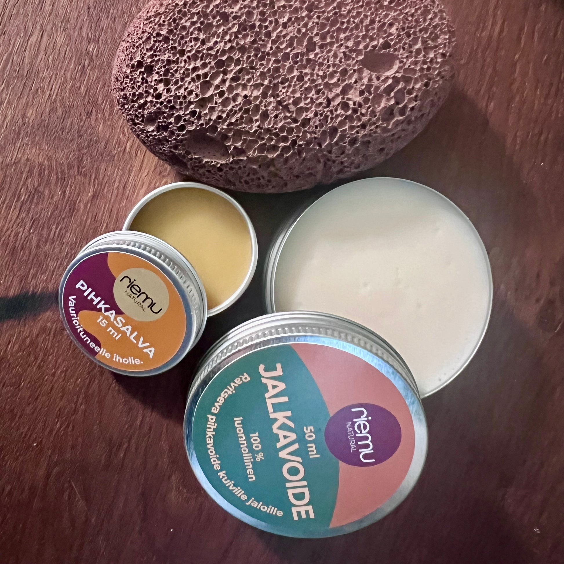 Voitele puhdistetut jalat Pihka-jalkavoiteella mieluiten heti suihkun, kylvyn tai saunan jälkeen, kun iho on kostea ja pehmeä. Jalkavoidetta voit käyttää vaikka joka päivä. Mitä kuivemmat jalkasi ovat, sitä useammin niitä kannattaa rasvata.